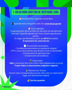 A 1ª via da Nova Carteira de Identidade Nacional (CIN) é gratuita e o atendimento é realizado mediante agendamento prévio pelo site.