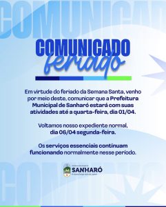 Em virtude do feriado da Semana Santa, venho por meio deste, comunicar que a Prefeitura Municipal de Sanharó estará com suas atividades até a quarta-feira, dia 01/04. Voltamos nosso expediente normal, dia 06/04 segunda-feira.